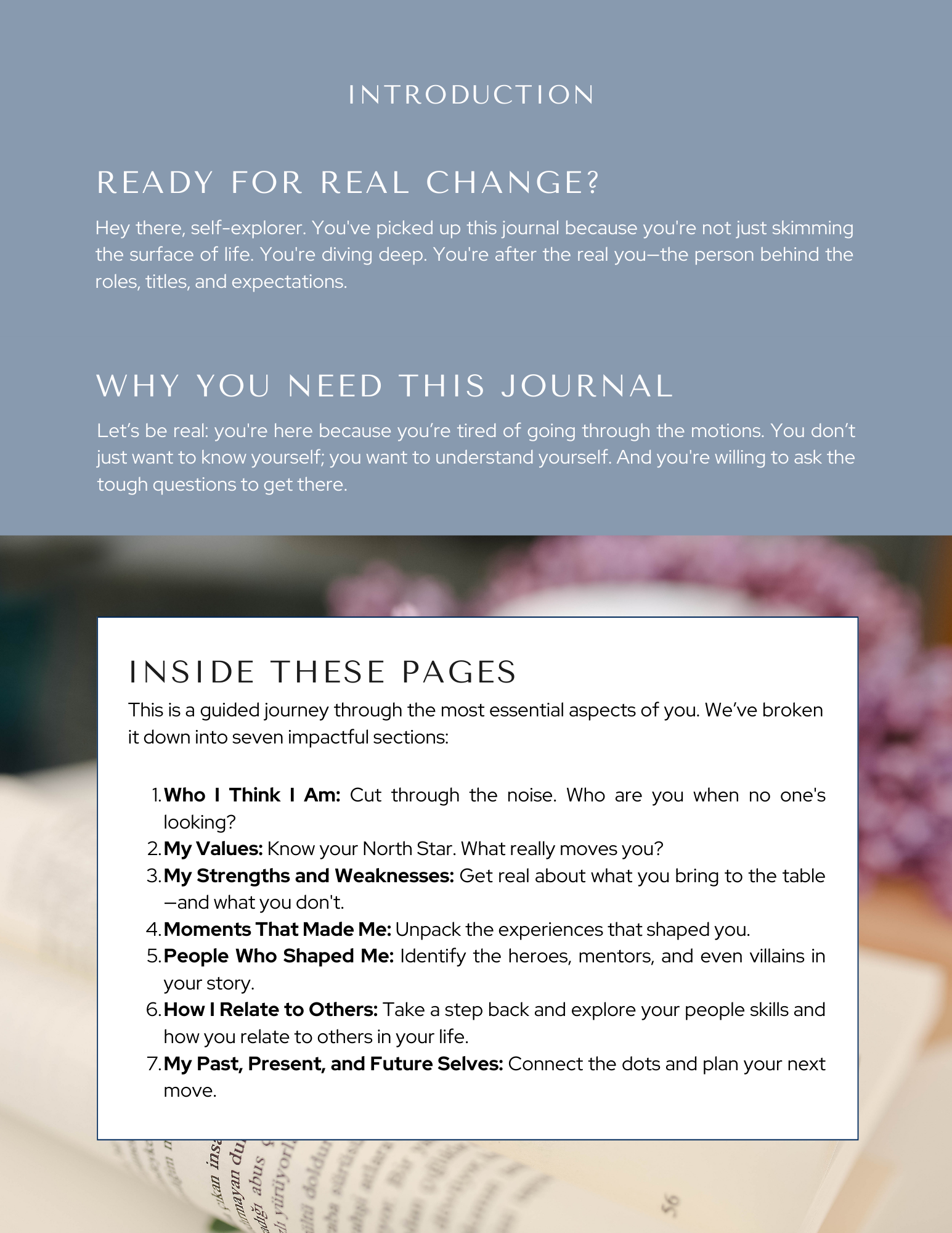Are you tired of going through the motions. You don’t just want to know yourself; you want to understand yourself. And you're willing to ask the tough questions to get there. (73 pages)